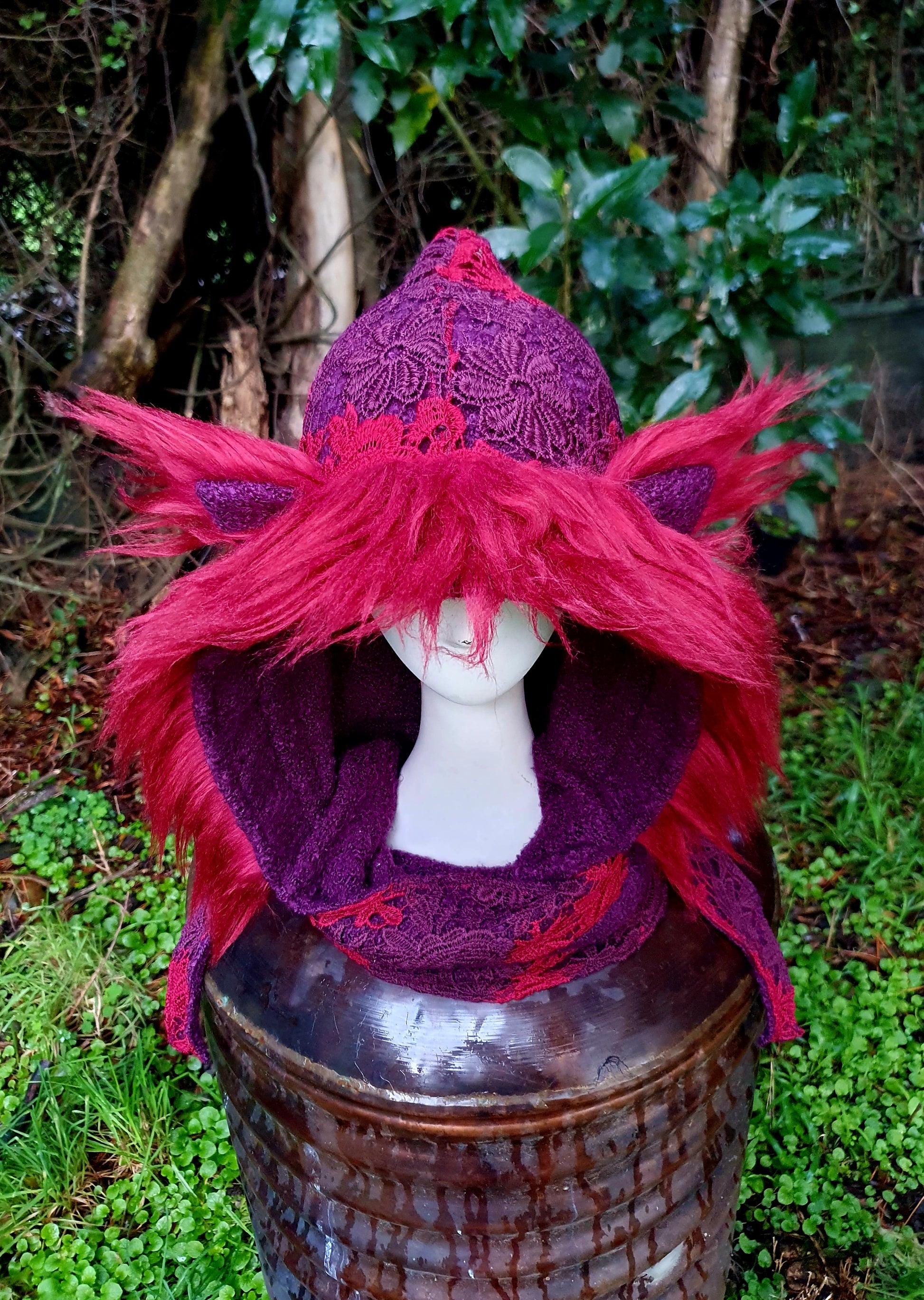 Made from lovely autumnal shades of purple and red, this hooded scarf is hottt! Lined with a stretchy, chunky acrylic wool blend that sits so softly against the skin and finished with a red faux fur trim and ears.