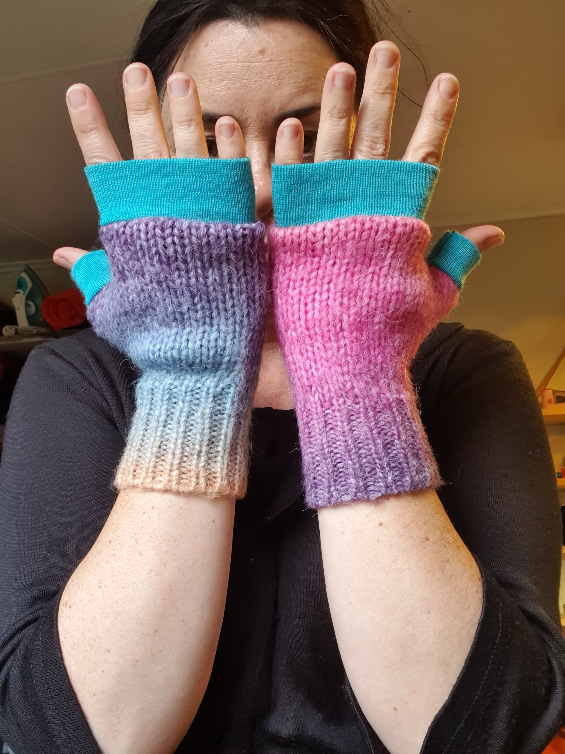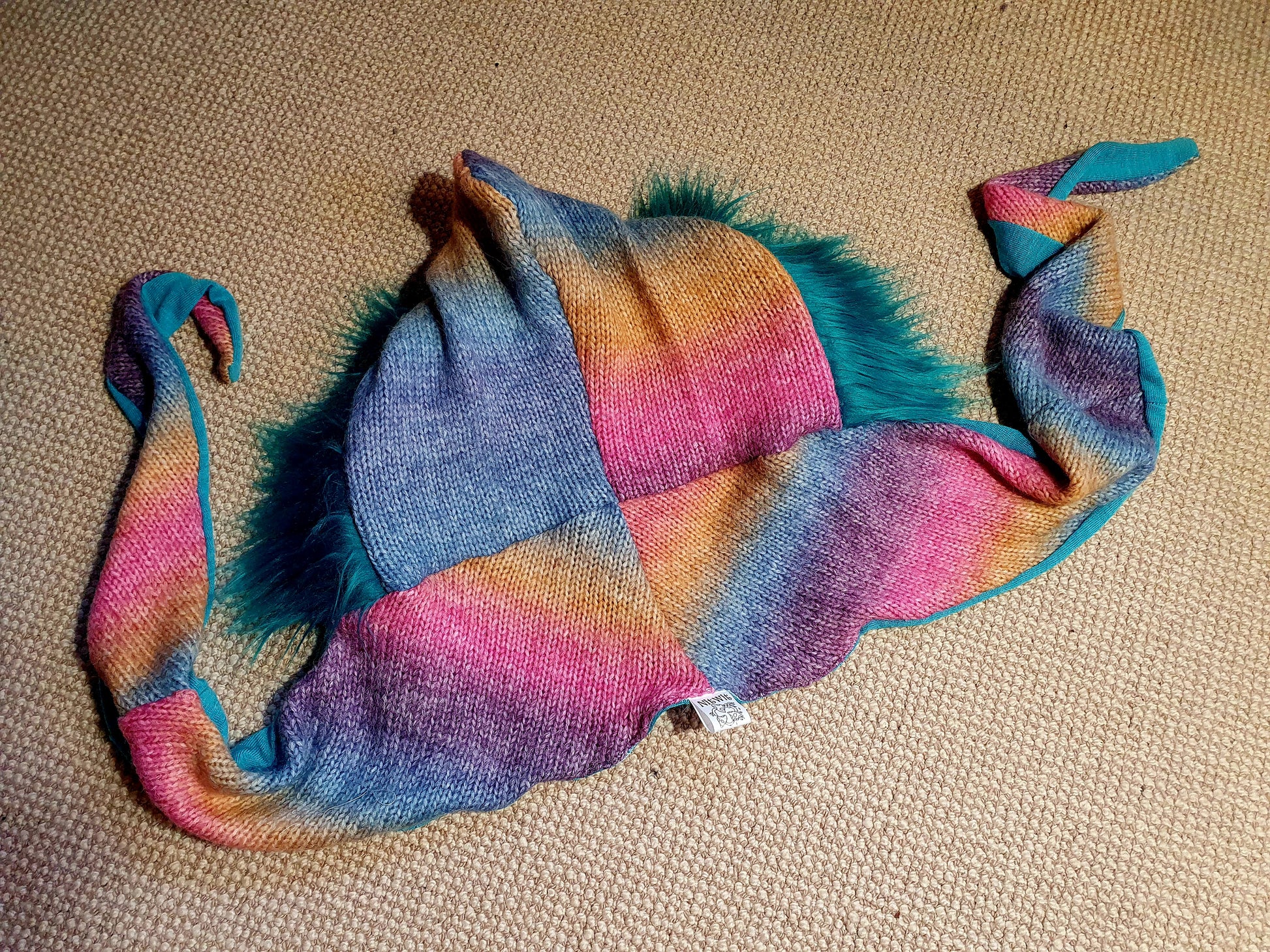 Chunky rainbow knit hooded scarf lined with blue merino and finished with teal blue merino. Matching fingerless gloves sold separately